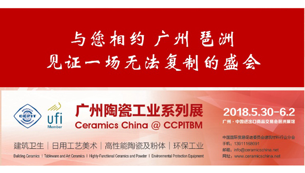 在国内外陶瓷行业相关组织、广大企业、新闻媒体及社会各界的大力支持下,经过主办单位一年多的精心筹备,2018年中国国际广州陶瓷工业展,今天在广州隆重开幕。 出席开幕式的国家部委主管领导及主办单位的领导有:中国建筑材料联合会会长乔龙德先生,中国建筑材料联合会原会长张人为 先生,国家市场监管总局质量监督司巡视员郑卫华先生,工信部原材料司副巡视员吕桂新先生,中国建筑材料联合会秘书长孙向远先生,中国建筑材料联合会副会长、中国贸促会建材分会会长陈国庆先生,中国建筑材料联合会副会长张东壮先生,中国建筑卫生陶瓷协会常务副会长缪斌先生,中国建筑卫生陶瓷会秘书长吕琴女士,中国建筑材料联合会副秘书长、协调服务部主任贺军先生,中国贸促会建筑材料行业分会副会长周治洲先生,中国陶瓷工业协会常务副理事长傅维杰女士,中国陶瓷工业协会副理事长董博先生,中国陶瓷工业协会秘书长侯文全先生。 出席今天开幕式的相关国际机构嘉宾有: &nb